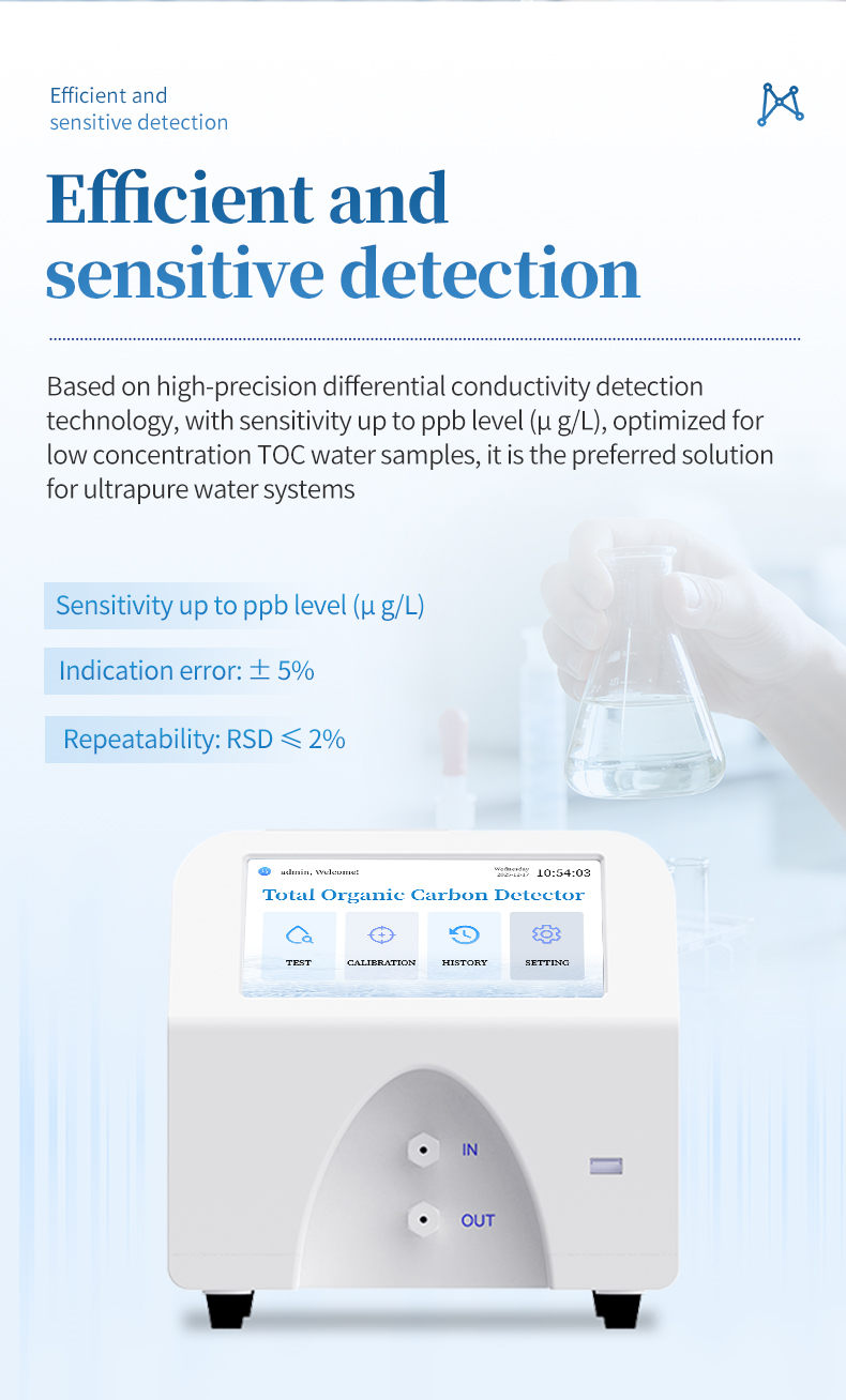 The product has the characteristics of low detection limit, high sensitivity, fast response speed, and good stability. The operating interface is simple and easy to use. It can be widely used for the detection of production water, injection water, and purified water in industries such as pharmaceuticals, microelectronics, and power. It is a reliable tool to ensure water quality safety and meet the requirements of pharmacopoeia and relevant industry regulations.